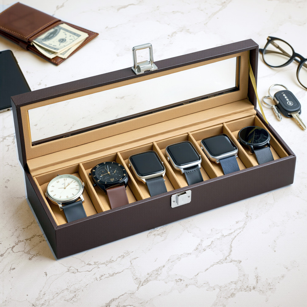 Premium Faux Leather See Through 6 Slots Wrist Watch Organiser Box for Men & Women | Watch Storage Box Organizer | Watch Collection Box/Case/Holder | Cream & Grey
