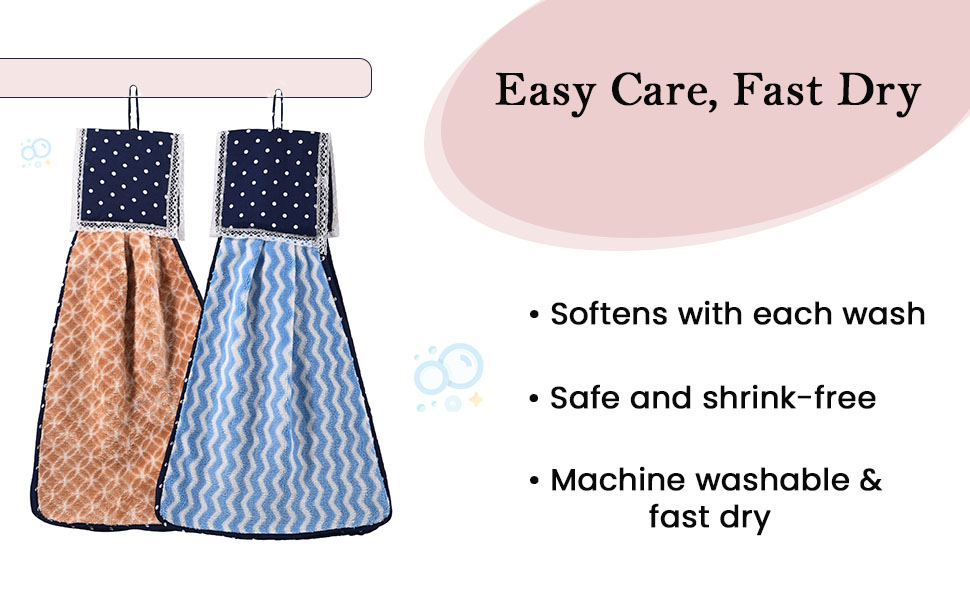 EASY CARE & FAST DRY - These hand towel hanging are perfectly machine washable and dry very fast too. They become even plusher and softer fluff after the first wash, They are completely safe in wash machine and cause no shrinkage.