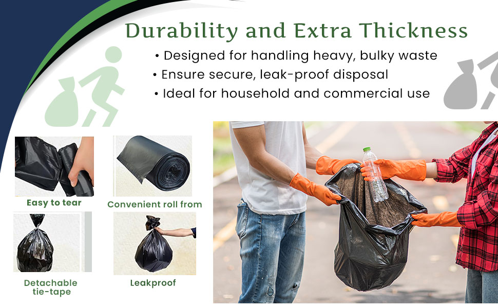 HEAVY-DUTY STRENGTH WITH EXTRA THICKNESS - Heavy-Duty Strength with Extra Thickness: Designed for durability, these garbage bags feature extra thickness to prevent tearing or puncturing. Perfect for handling heavy and bulky waste, they ensure secure, leak-proof disposal for both household and commercial use.