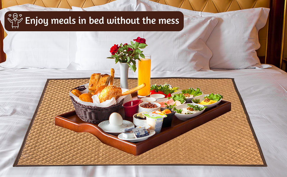 NON- WOVEN MATERIAL - This Bed mat for eating food is made of high - quality non - woven material and has a PVC laminated coating. This means that it is waterproof, does not absorb stains and water and your bed will always remain clean and safe