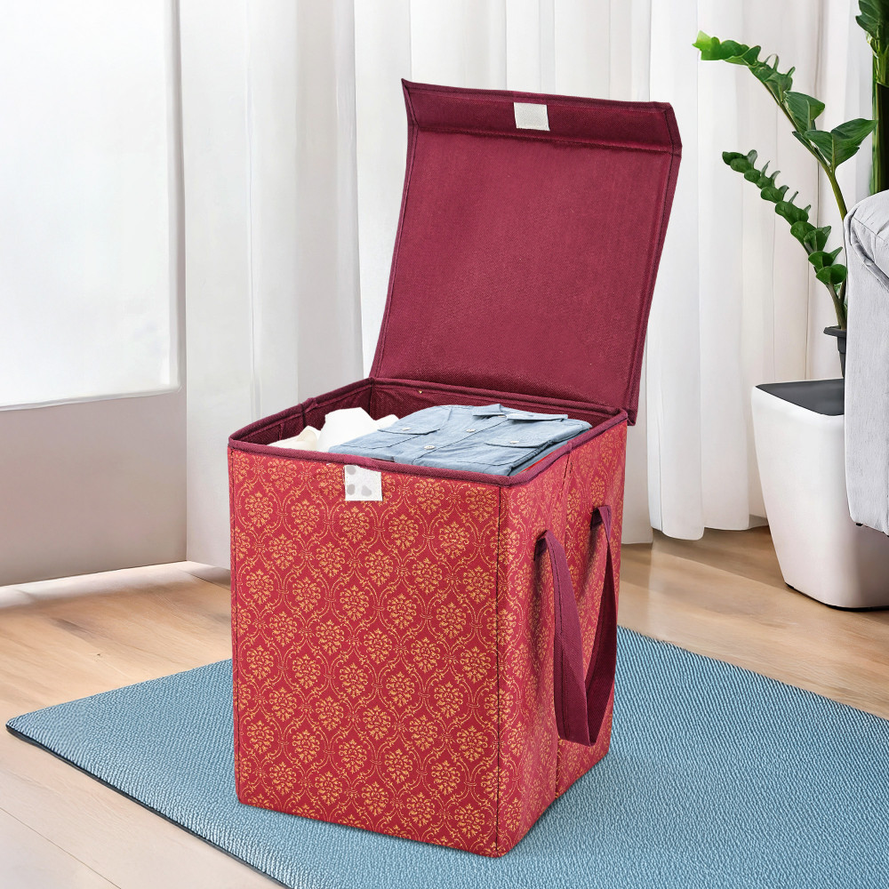 Package CONTAINS - (1 Pcs) Storage Box | Color - Golden Print - Maroon | Material - Non Woven | Product Dimensions - 31 cm x 31 cm x 39 cm