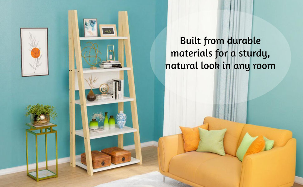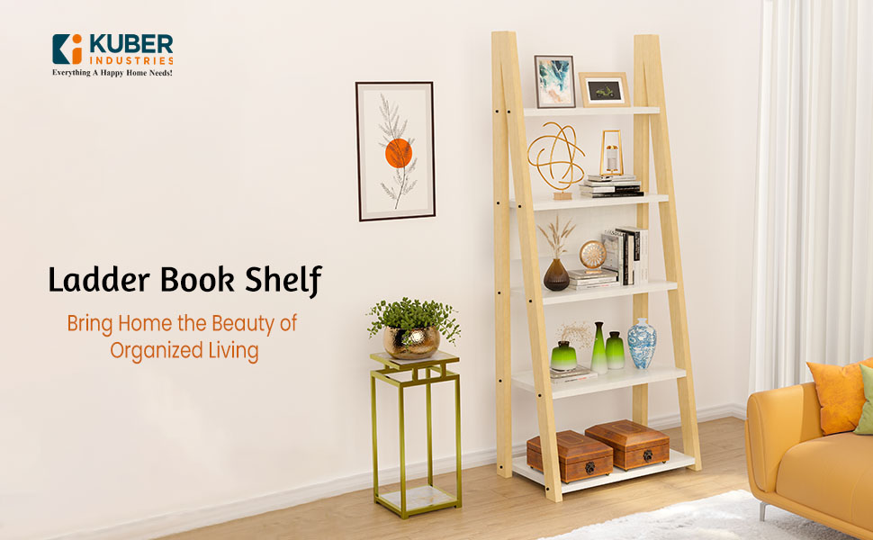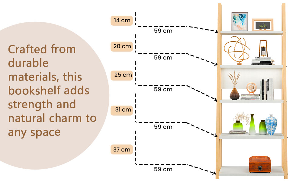 Package CONTAINS - (1 Pcs) Book Shelf With Ladder | Color - White & Brown | Material - Wooden | Product Dimensions - (Book Shelf) 64 cm x 38 cm x 175 cm | (Deck 1) - 59x14 cm, (Deck 2) - 59x20 cm, (Deck 3) - 59x25 cm, (Deck 4) - 59x31 cm, (Deck 5) - 59x37 cm | (Gape in each Deck- 33 cm)