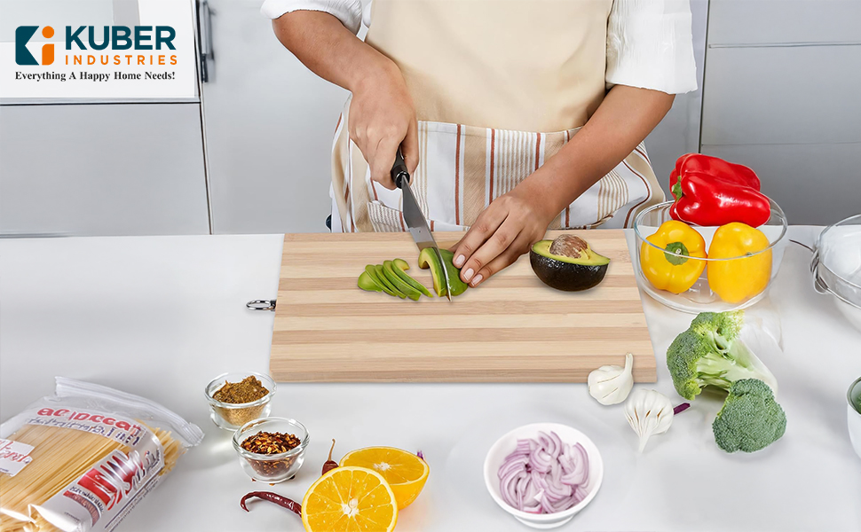 STURDY AND DURABLE - The bamboo wood construction ensures the board's sturdiness and durability, allowing it to withstand regular use in the kitchen. It is designed to resist warping, cracking, and splitting, providing a reliable and long- lasting chopping and cutting surface.