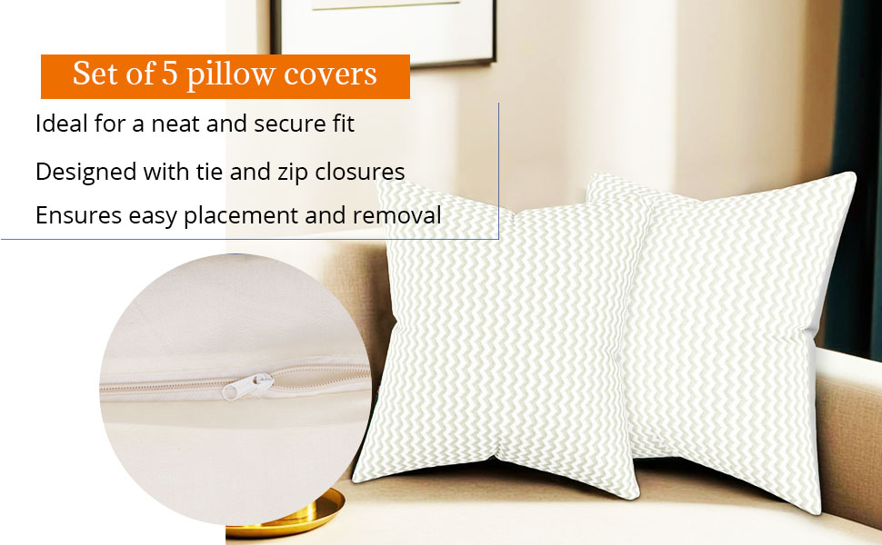 ZIPPERS CLOSURE - The invisible zipper ensures a seamless look and easy insertion/removal of cushions. These easy to maintains sofa cushion cover set of 5 will make your space look elegant and beautiful without you having to worry about their upkeep