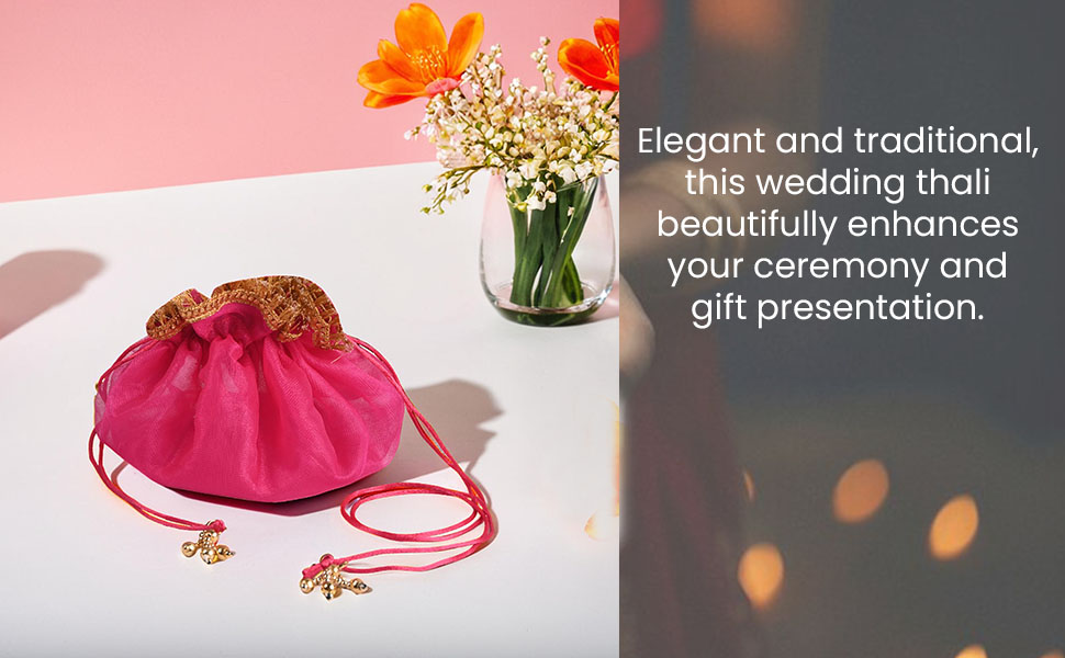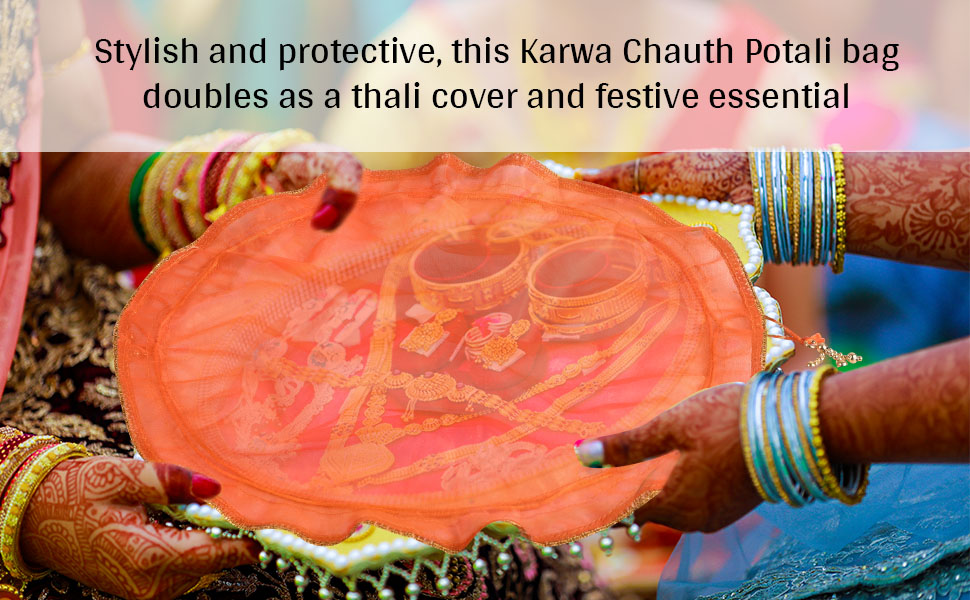 FOR KARWA CHAUTH & EVERYDAY USE - This versatile Thali Cover for Karwa Chauth cum Potali bag cover protects your thali and doubles as a stylish Potali bag. Perfect for carrying small essentials like kumkum, bangles, and other festive items.