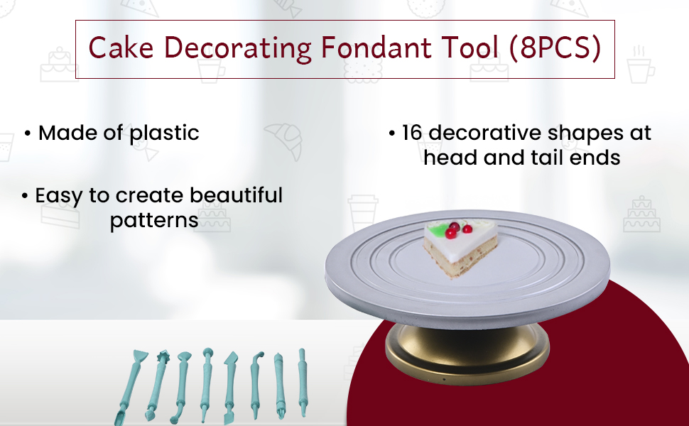 PACKAGE CONTAINS - 1 Pcs Cake Stand with 8 Pcss Fondant Tools | Color - Silver & Gold | Material - Plastic | Product Dimensions - Cake Stand - 29 cm x 29 cm x 10 cm, Fondant Tools - 16 cm x 1 cm x 1 cm
