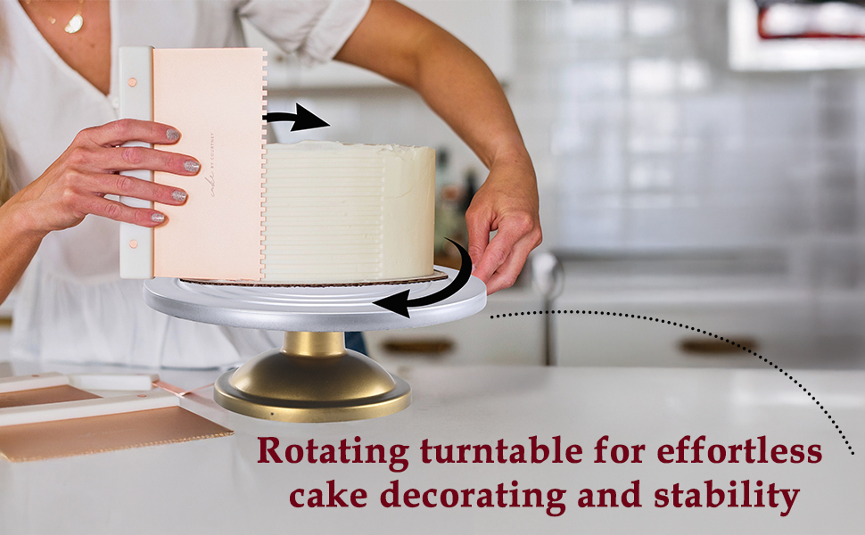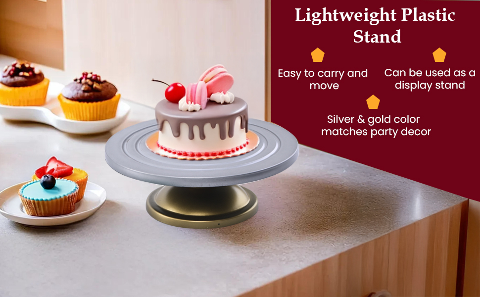 MATERIAL & DESIGN - The rotating plastic turntable allows you to freely turn your cakes with ease, allowing for easy piping, smoothing and decorative touches. The design which prevents your cake from moving about.