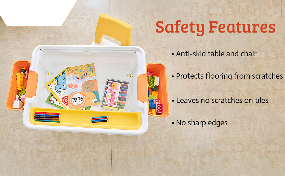 SAFETY FEATURES - An anti-skid table and chair protect your flooring from scratches.Leaves no scratches on tiles. There are no sharp edges and all the corners have been rounded to make sure study time injury free