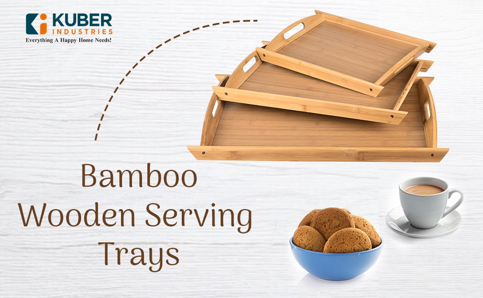 PACKAGE CONTAINS - (3 Pcs) Set of 3 Serving Trays | Material - Bamboo Wooden | Product Dimension - (Large) 49 cm x 34 cm x 5 cm, (Medium) 42 cm x 30 cm x 5 cm, (Small) 34 cm x 25 cm x 5 cm
