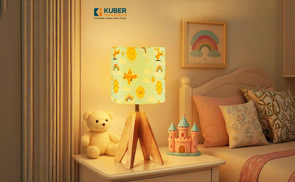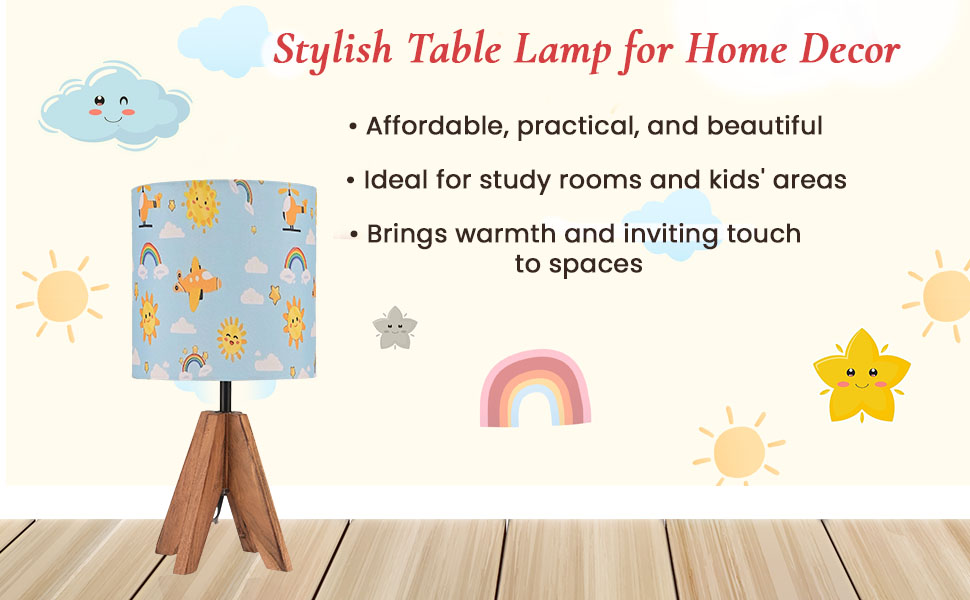 Package CONTAINS - (1 Pcs) Table Lamp | Sun Printed - Blue & Yellow | Material - Cover (Pvc & Polyester) + Stand (Engineered Wood) | Product Dimensions - 20 cm x 20 cm x 41 cm