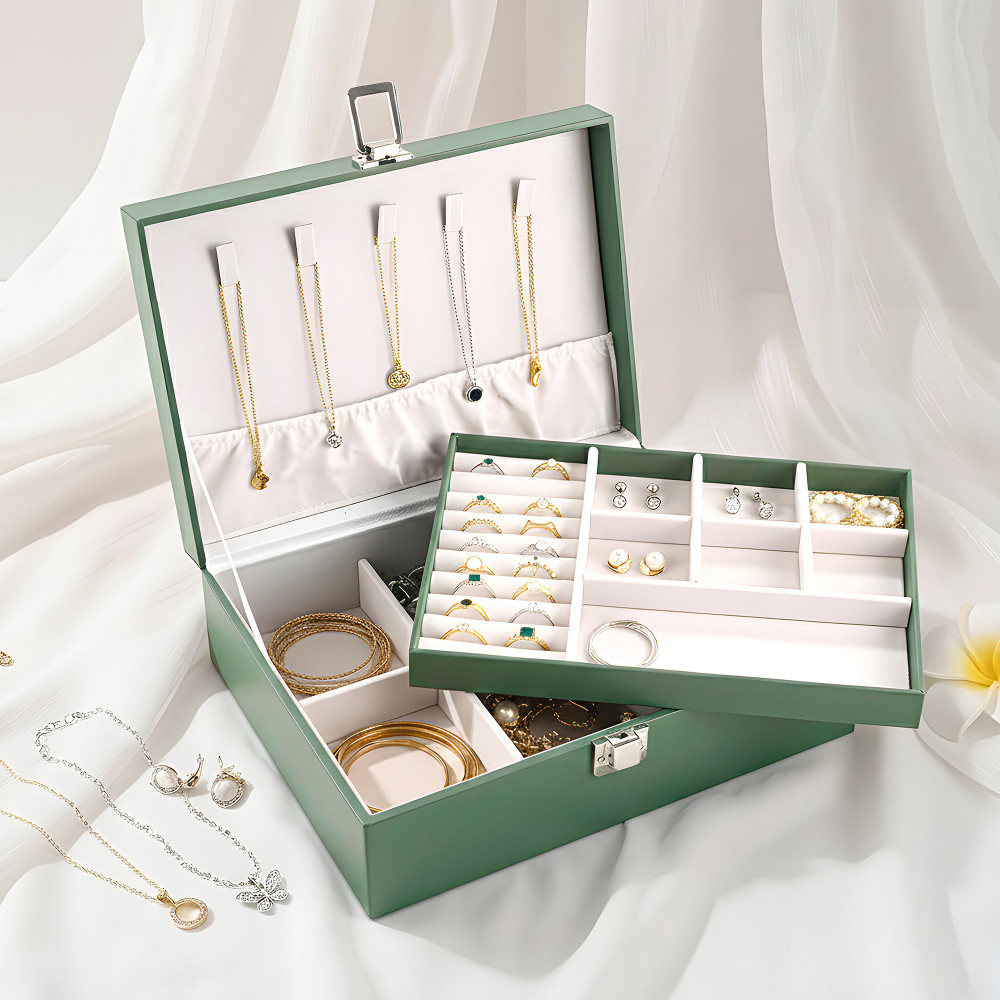 PACKAGE CONTAINS - (1 Pc) Jewellery box/Organizer | Color - Green | Material - Leather | Product Dimensions - 23 cm x 17 cm x 9 cm