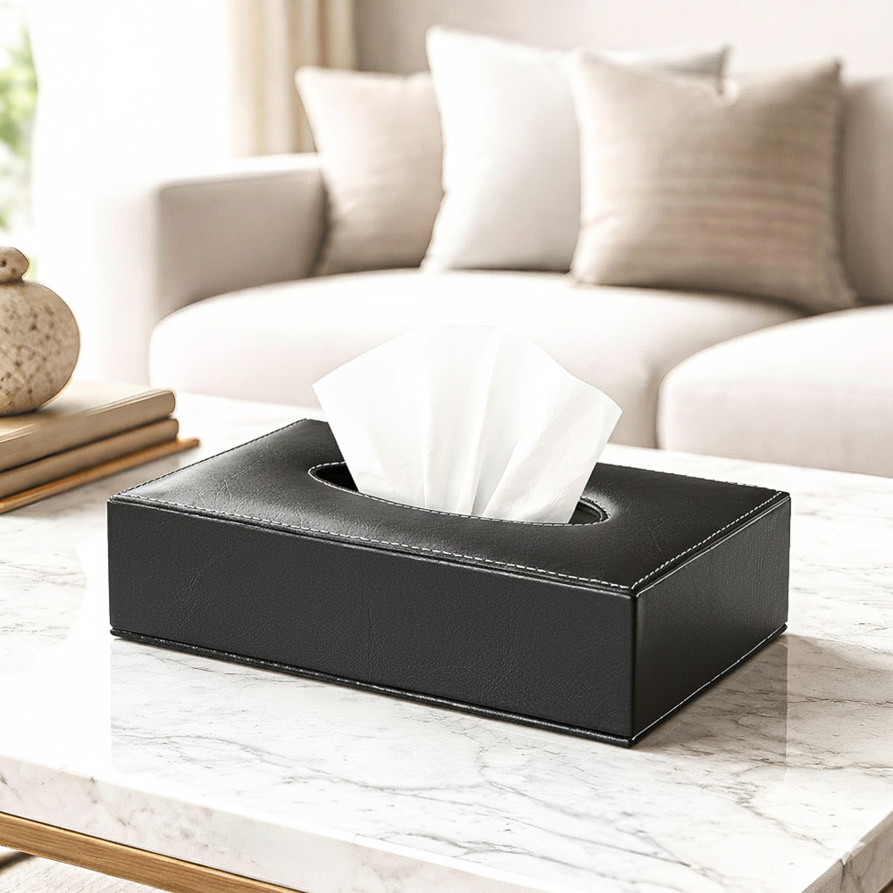 SLEEK LEATHER LOOK - This black leather tissue holder adds a clean, modern touch to dining tables, office desks, reception counters and car dashboards. The stitched edges and simple rectangular shape blend well with home and office décor while keeping tissue papers neatly covered and ready to pull.